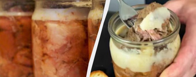 לעולם אין לערבב את הבשר עם כפית במהלך הבישול. לאחר שעתיים פותחים את המכסה ולוחצים על הבשר כך שהשומן יעלה למעלה ויהיה מעל מפלס הבשר. סוגרים שוב את המכסה, מבשלים עוד שעה ואז מוסיפים את עלה הדפנה. מחזירים את המכסה למקומו ומבשלים שעה וחצי עד שעתיים. בדוק אם חתיכות החזיר מתפרקות בעת הלחיצה. אם זה קורה, אז התבשיל מוכן. אפשר לשים בצנצנות מעוקרות ולאחסן.