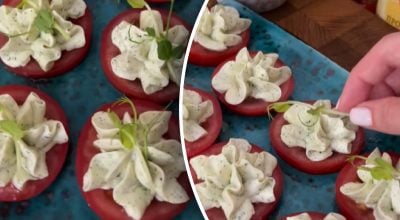 השלב הבא הוא לחתוך את העגבניות לעיגולים ולפזר את תערובת הביצים-גבינה על כל אחת מהן באמצעות שקית זילוף. המתאבן מוכן, נשאר רק לקשט אותו בעשבי תיבול.